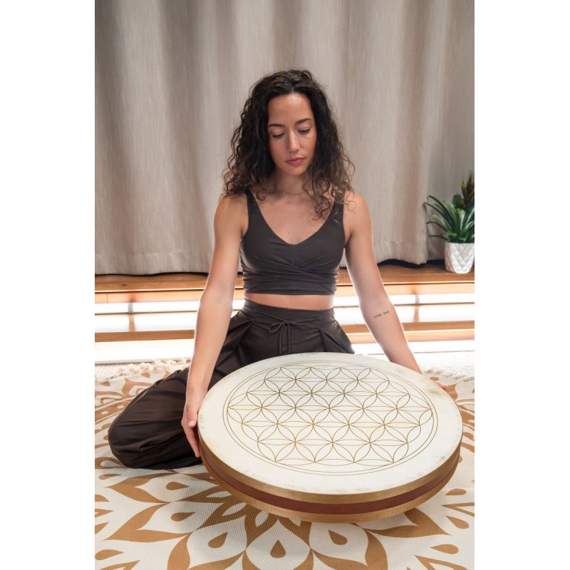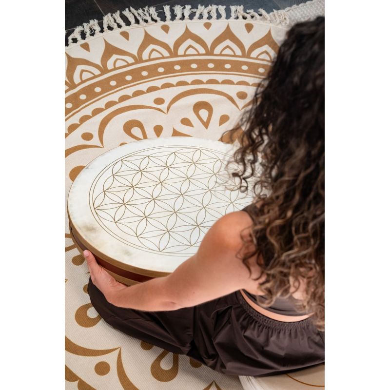 Los tambores Wave Flower of Life están fabricados con dos parches de piel de cabra natural y cuentan con un relleno suave especial en su interior, que crea un sonido de olas especialmente suave. Decorados con la simbólica Flor de la Vida, también poseen una fuerte presencia visual y espiritual.Diámetro: 22'' / 55,9 cm Profundidad: 2,5'' / 6,5 cm Material: Roble de Siam (Hevea brasiliensis Muell.-Arg.), piel de cabra, cuentas de vidrio y amaranto'