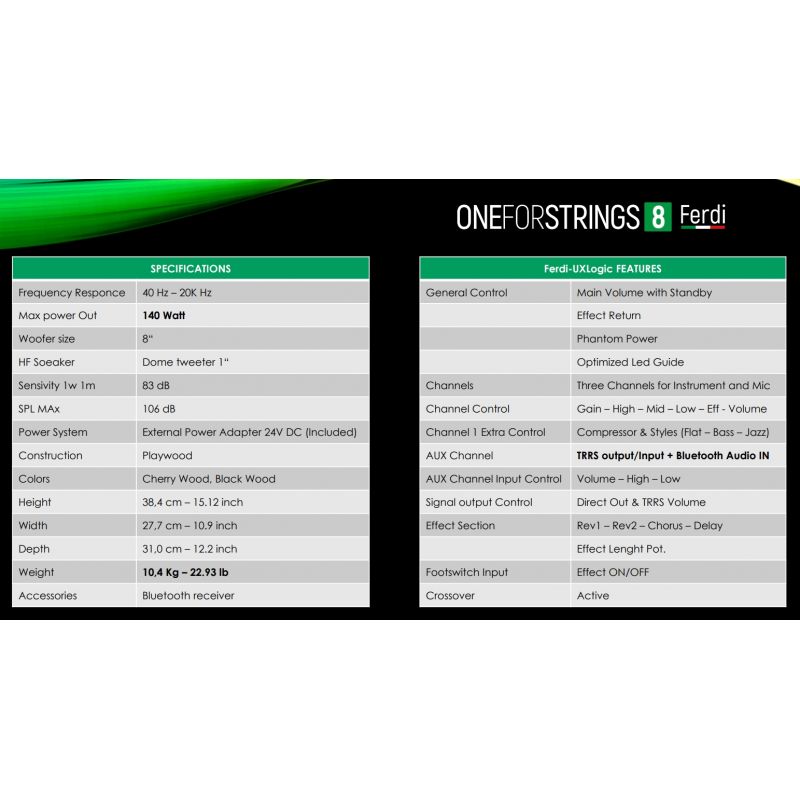 ONEFORSTRINGS 8FERDI è, un amplificatore per chitarra acustica e classica da 150 Watt dotato di 3 ingressi separati + un ingresso Aux