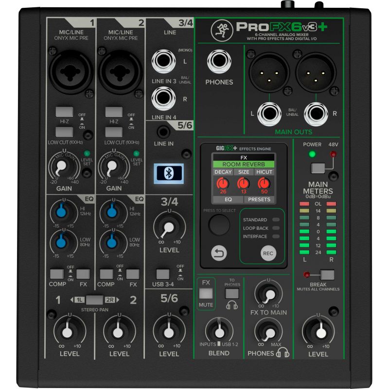 A Mackie ProFX6v3+ é uma mesa de mistura analógica profissional de 6 canais com interface de áudio para gravação e transmissão, com pré-amplificadores e EQ Onyx, modos de gravação USB comutáveis, Bluetooth® bidirecional e efeitos GigFX+ melhorados que pode ajustar num ecrã LCD a cores.
